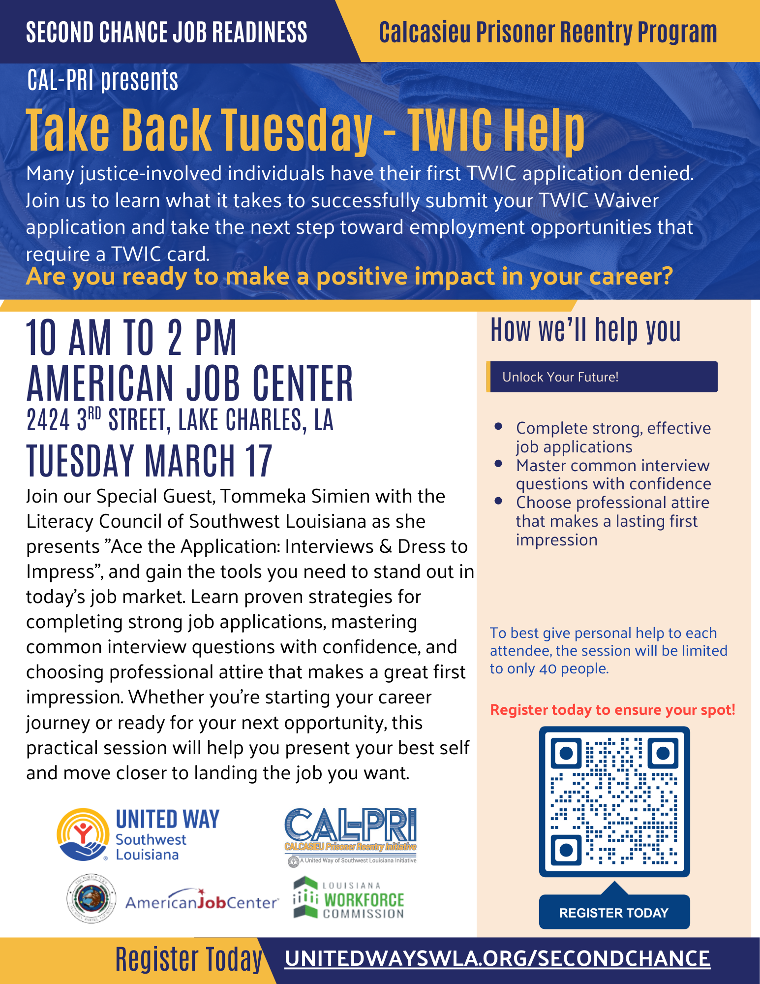 Join our Special Guest, Tommeka Simien with the Literacy Council of Southwest Louisiana, as she presents "Ace the Application: Interviews & Dress to Impress", and gain the tools you need to stand out in today's job market. Learn proven strategies for completing strong job applications, mastering common interview questions with confidence, and choosing professional attire that makes a great first impression. Whether you're starting your career journey or ready for your next opportunity, this practical session will help you present your best self and move closer to landing the job you want.