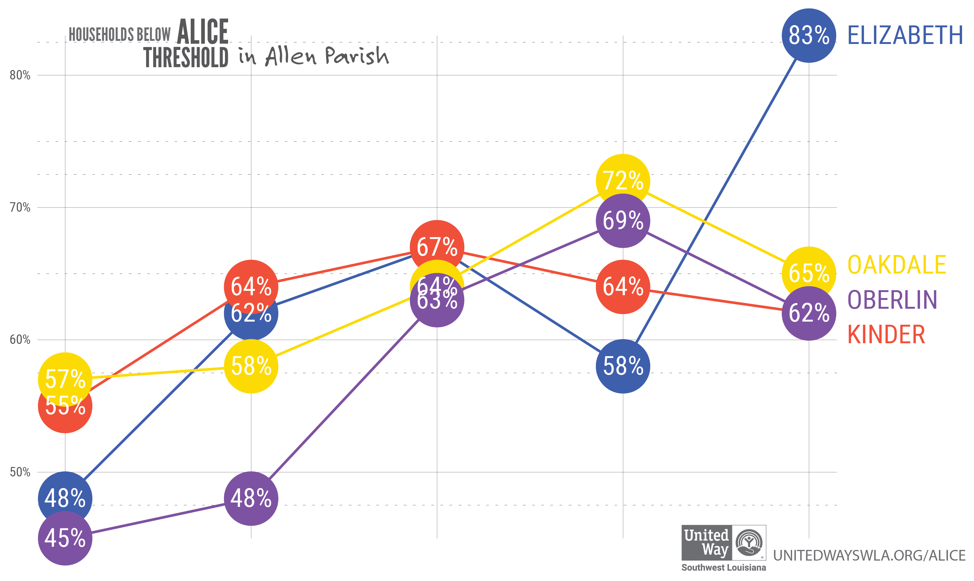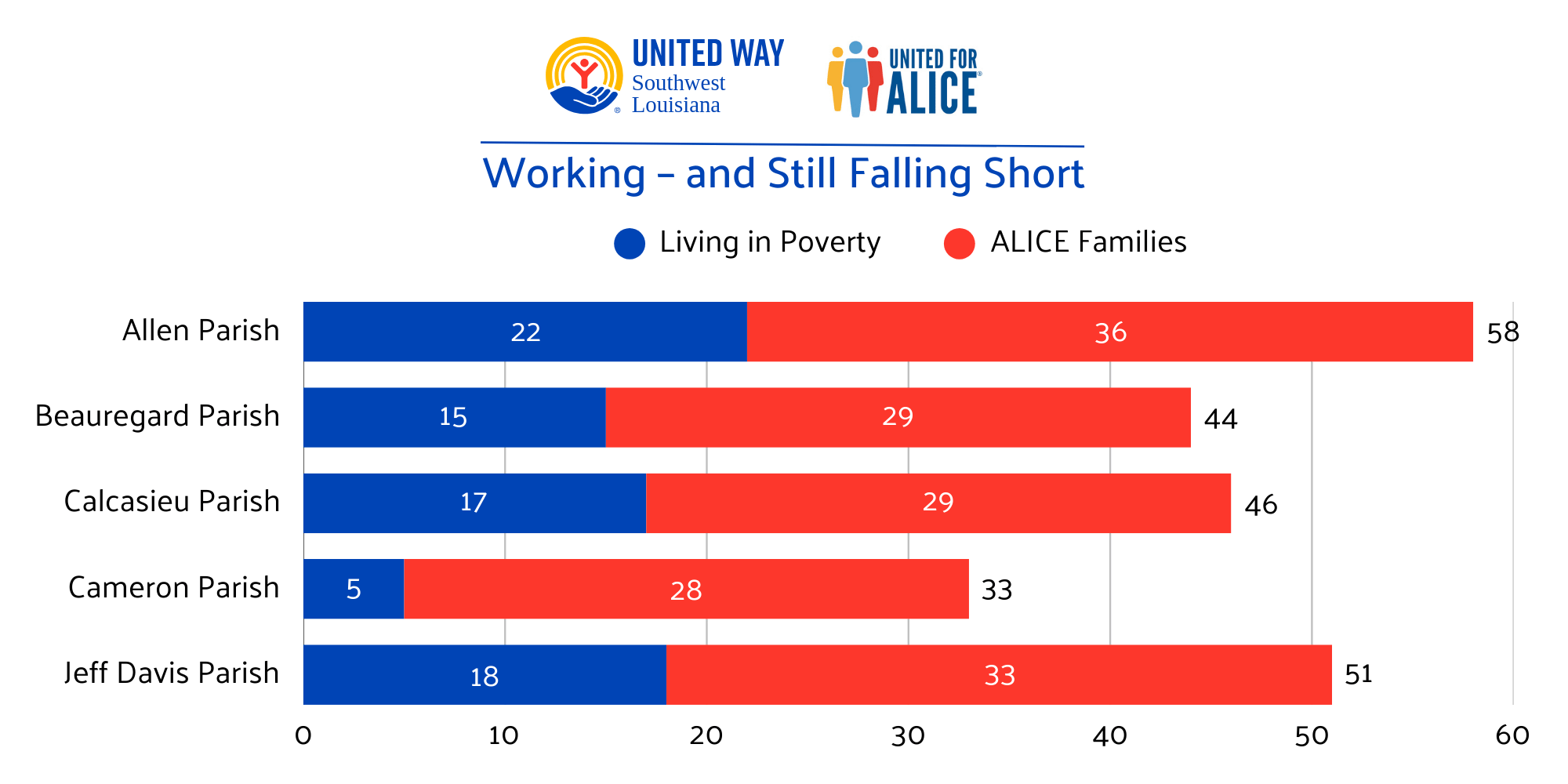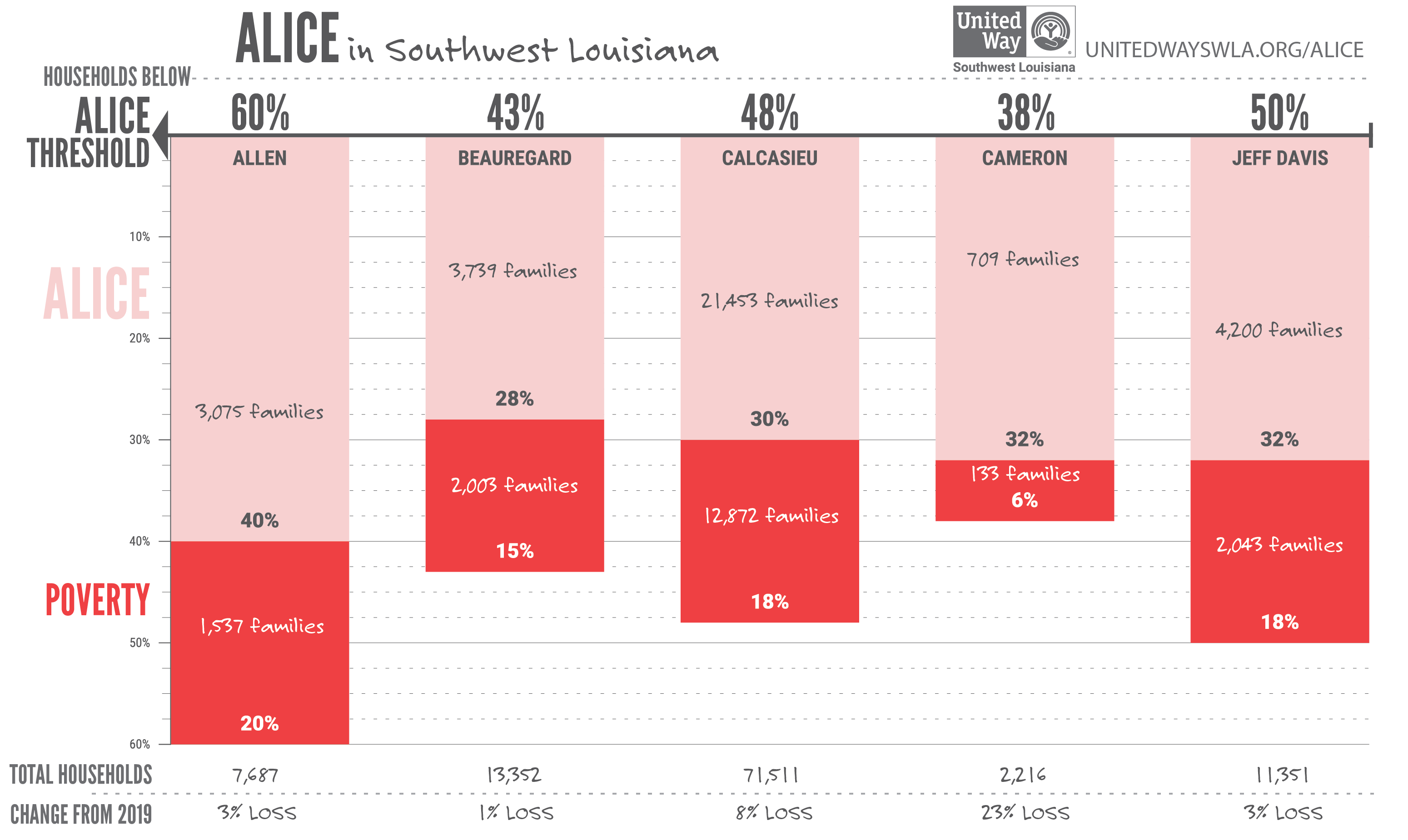In Southwest Louisiana, 46 percent of the households that make up Allen, Beauregard, Calcasieu, Cameron and Jefferson Davis Parishes are living at or below the ALICE Threshold. Eighteen towns and cities across the region, including the largest - Lake Charles, have at least 40% of households struggling to make ends meet.